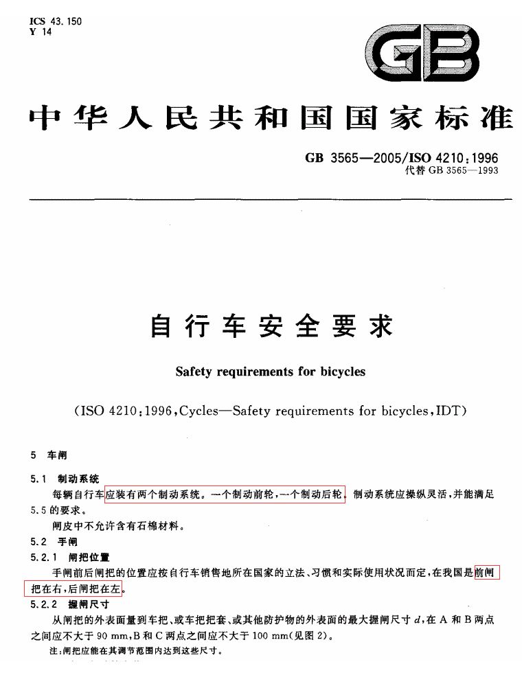 其實,在《中華人民共和國國家標(biāo)準(zhǔn)》關(guān)于“自行車安全的要求”中,我國對自行車的剎車有著明確且統(tǒng)一的標(biāo)準(zhǔn)和規(guī)定:
