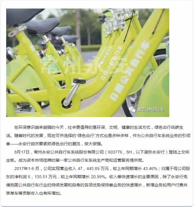如今,永安行已成功登陸上交所主板。對于永安行來說,本次公開發(fā)行上市是一個契機(jī),來保持和強(qiáng)化公司目前的領(lǐng)先市場地位,并充分利用近年來行業(yè)高速發(fā)展的有利條件,以公共自行車系統(tǒng)為核心產(chǎn)品,豐富業(yè)務(wù)類型,促進(jìn)用戶數(shù)量快速提高,推動公司業(yè)績持續(xù)健康增長。接下來永安行還將借助資本平臺來保持企業(yè)的長青發(fā)展。