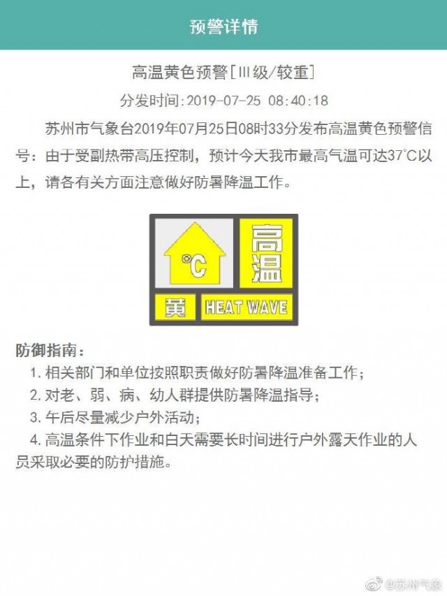 蘇州市氣象臺2019年07月25日08時33分發(fā)布高溫黃色預(yù)警信號:由于受副熱帶高壓控制,預(yù)計今天我市最高氣溫可達(dá)37℃以上,請各有關(guān)方面注意做好防暑降溫工作。