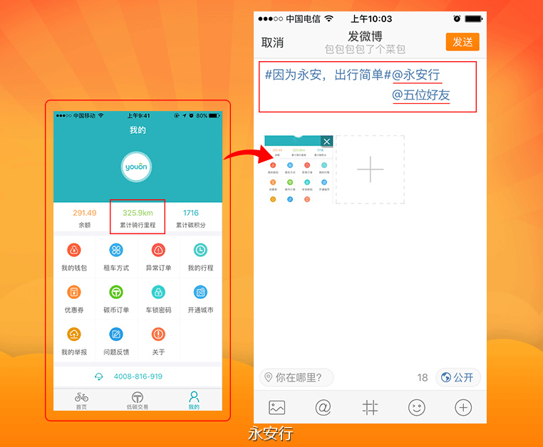 活動(dòng)詳情:在規(guī)定時(shí)間內(nèi),關(guān)注“永安行”官方微博,將你的永安行app中,"累計(jì)騎行里程"截圖發(fā)到微博,帶上話題#因?yàn)橛腊玻鲂泻?jiǎn)單#,@永安行 以及5位好友,均有機(jī)會(huì)獲得“永安新年驚喜福袋”。