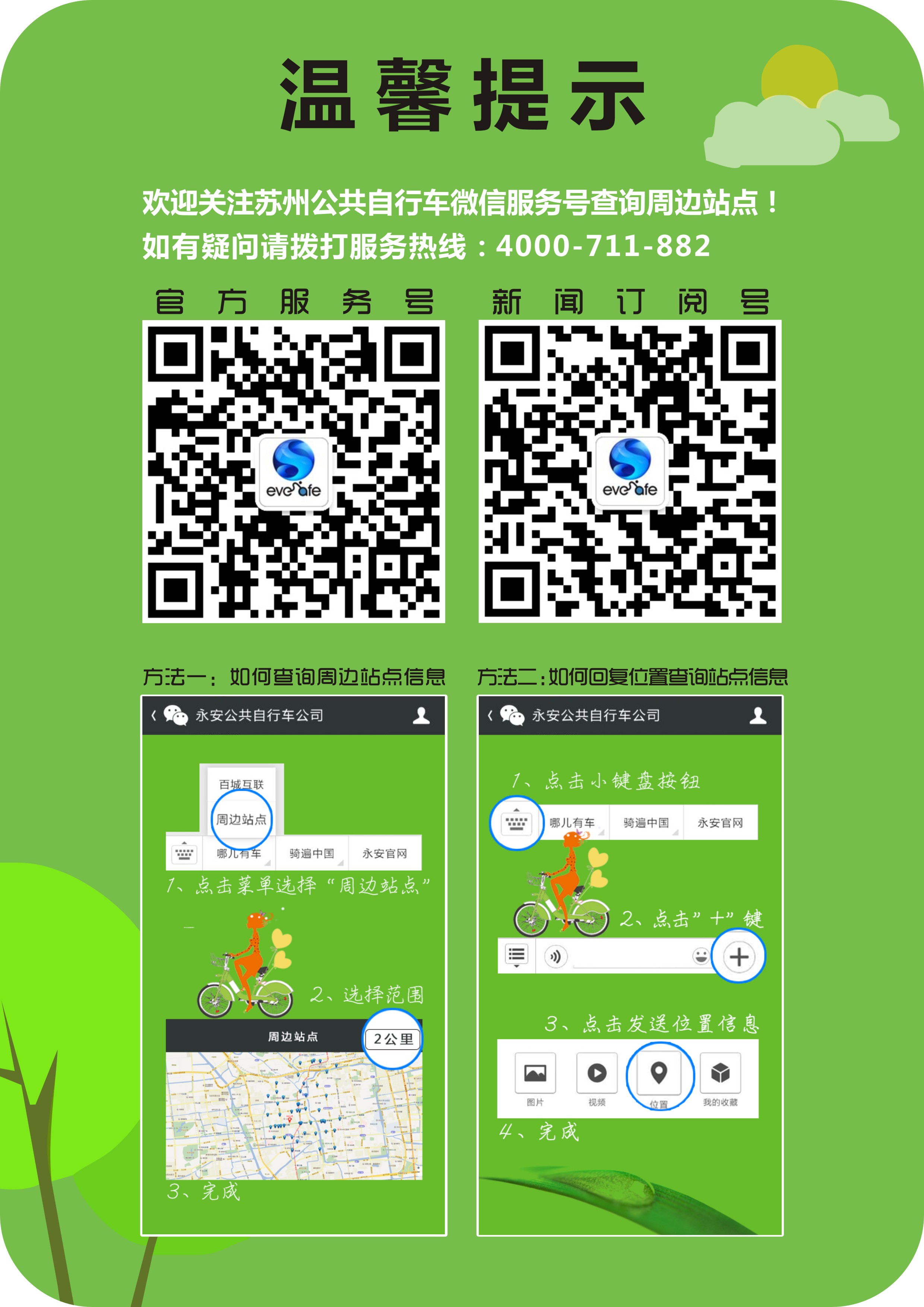 為了更方便市民借還公共自行車,現(xiàn)總公司推出了通過手機微信快捷查詢公共自行車的借還狀況。微信號:ibike668 微信名:永安公共自行車公司,手機掃二維碼也可加入。加入永安公共自行車微信之后,微信下方會顯示“哪兒有車”,周邊站點、地圖都能顯示,市民可以根據(jù)自身要求查詢所需要的信息。如下圖:
