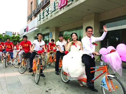 □商報(bào)記者 崔陽陽 文/攝 在蘇州,結(jié)婚車隊(duì)不乏開著寶馬奔馳,抑或更為豪華奢侈的進(jìn)口大牌車??勺蛱欤瑓墙瓍^(qū)的一對(duì)小夫妻,卻選擇了另一種新奇浪漫的方式,公共自行車成了新郎迎娶新娘的另類座駕。盧云龍,剛大學(xué)畢業(yè)的一伙子,用他的汗水和誠意娶上了心目中最美的媳婦?! 墙瓍^(qū)江陵西路的一小區(qū)里,鞭炮、禮杖聲聲入耳,有個(gè)小子要娶媳婦,竟然用的是公共自行車!這個(gè)消息傳遍了整個(gè)小區(qū)。20輛公共自行車整整齊齊地排列在盧云龍家樓下,每輛自行車的車頭還掛著喜氣的紅花,其中最醒目的雙人自行車正是盧云龍迎娶新娘鄭丹的牛氣座駕,粉色的氣球組合在車頭迎風(fēng)飄逸。一大早,吳江區(qū)公共自行車管理中心的工作人員就已經(jīng)把這20輛自行車送到了盧云龍家樓下。工作人員告訴記者,新郎是通過12345市民熱線聯(lián)系到他們的,當(dāng)?shù)弥孕熊囀怯糜诮Y(jié)婚車隊(duì)時(shí),中心決定免費(fèi)為新郎提供,還專門送到家?!斑@也是低碳環(huán)保的一種方式,我們當(dāng)然會(huì)支持?!惫ぷ魅藛T說。 盧云龍騎著雙人自行車,帶著他的那幫哥們姐們,在酒店迎娶到了他心愛的姑娘鄭丹。“我老婆是山東淄博人,所以迎娶前就把她安排在酒店里。”天氣的炎熱讓盧云龍滿頭大汗,卻掩藏不住他娶媳婦的興奮,被抱上車的新娘鄭丹也是笑靨如花。中山北路、江興西路、西塘河路、江陵西路,自行車迎親隊(duì)一路洋洋灑灑,振臂高呼“新婚快樂”,引起了不少路人的注意。家住嘉鴻花園的畢先生告訴記者,“今天周末起了個(gè)早,沒想到看到用自行車結(jié)婚的新鮮事,現(xiàn)在年輕人了不得?!睋?jù)了解,這次騎自行車結(jié)婚的策劃幾乎都是新郎一人全程策劃。大到和城管聯(lián)系借到公共自行車,小到上淘寶買紅色“搶親”t恤,都是盧云龍一手操辦。“寶馬奔馳的車隊(duì)太多了,我和她想有個(gè)不一樣的記憶,組個(gè)自行車隊(duì)迎娶不僅低碳環(huán)保,也重溫了一把大學(xué)時(shí)光,我倆都覺得很浪漫?!毙吕杀R云龍開朗而熱情。盧云龍和他的新娘鄭丹都是青島農(nóng)業(yè)大學(xué)的大四畢業(yè)生,小夫妻兩人在大一的時(shí)候就相識(shí)了?!澳鞘且淮紊瞎_課,我去得晚,也找不到其他座位,就坐到了她的身邊,就這樣聊了起來。”沒想到一聊就聊成了一對(duì)眷侶,兩人到大一期末時(shí)就正式走到了一塊。接下來的三年時(shí)光,兩人最美好的回憶,莫過于兩人各騎一輛車去學(xué)校后面的山上玩?!澳蔷褪俏覀兊募s會(huì)。山上有許多果園,我倆一路騎行到山上,付給果農(nóng)50元,里面的蘋果、梨子、櫻桃,有啥都可以摘著吃,每次都盡興而歸。”盧云龍愉快地回憶著?! 〗衲?月兩人同時(shí)從大學(xué)順利畢業(yè),看著周圍的朋友不少畢業(yè)就分道揚(yáng)鑣,相愛的兩人決心給三年的愛一個(gè)完滿的結(jié)局,他們選擇了一畢業(yè)就結(jié)婚?!拔覀儛蹖?duì)方,各方面的條件也成熟,何苦拖時(shí)間為難自己?”盧云龍對(duì)自己的“畢婚”做這樣的解釋。 對(duì)于騎個(gè)自行車就把新娘娶回家的建議,最先提出的是他的妻子鄭丹。那時(shí)新人雙方家長(zhǎng)在一起商量車隊(duì)的事,是選用幾萬元的寶馬車隊(duì),還是選擇自家親戚組建車隊(duì),一直爭(zhēng)執(zhí)不下。這時(shí)候新娘鄭丹提了出來,“那干脆用自行車吧。”這個(gè)建議剛拋出就遭到了父母的反對(duì),“一生難得結(jié)次婚,不用輛好車說不過去,大人們都這么想?!辈贿^最后在小夫妻倆的堅(jiān)持下,父母終于想通了,還得到了家里不少親戚的支持?!斑@小奔子,思想很有創(chuàng)意,以前我們結(jié)婚的時(shí)候是用自行車的,現(xiàn)在他們年輕人又開始流行了,還說寶馬奔馳啥的太土?!北R云龍的舅舅告訴記者,“小奔子”正是盧云龍的小名。(責(zé)編:呂琳)